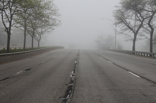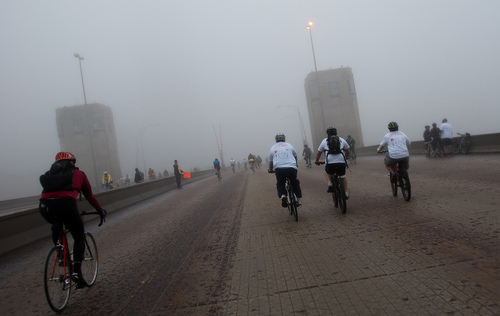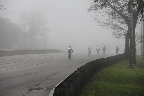 So why do I do this? Well, it’s fun. I know, I got up at 4am, took a CTA train through the fog (which got delayed 10 minutes at Addison because someone got in a fight), argued that I damn well was allowed to bring the bike on, and got a little lost when cellphone reception turned into a non-existent dream and I lost Sabrina. I could hardly see past my nose.